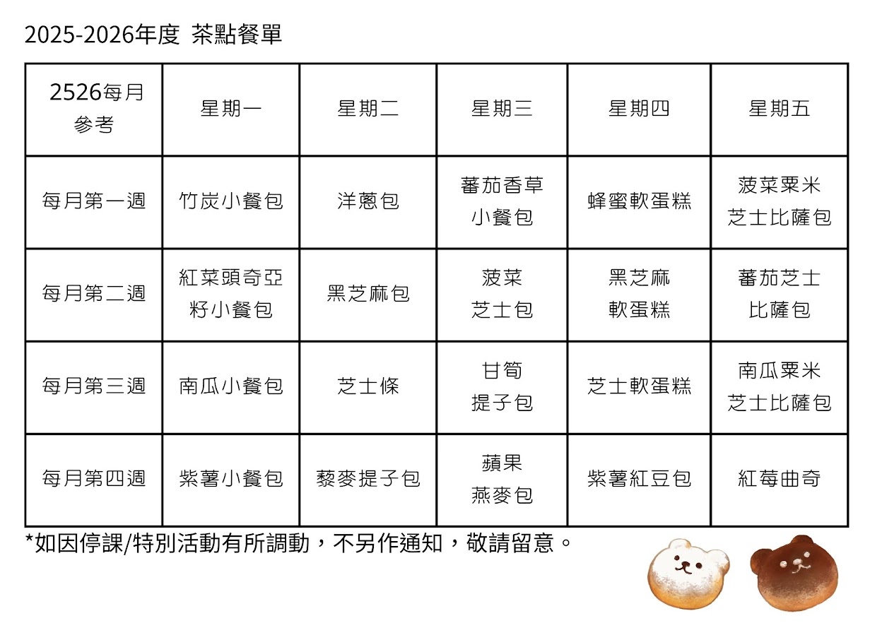 備註: (1) 上述食物安排會因個別原因變動,本園不作另行通知。
